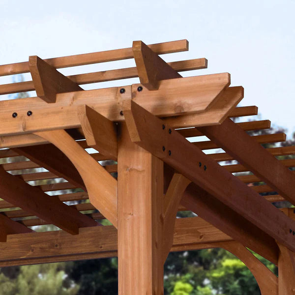 Enhance your backyard with the stunning Beaumont Pergola, where traditional design meets superior engineering. Constructed from 100% cedar wood, it exudes natural charm while providing lasting resistance against decay. From dinner parties to quiet morning coffee, the versatile design creates endless possibilities for your outdoor living space. Thoughtfully crafted with dual structural cross beams, robust support posts, and elegant corbels, this patio pergola delivers exceptional strength and enduring beauty. It’s Pro-Tect™ tested and proven to withstand winds of up to 100 mph* and includes thick, powder-coated steel anchoring plates, ensuring stability in the most extreme weather conditions. Our patented PowerPort™ features three USB ports and three electrical outlets to power a wide range of devices, lighting, and accessories. The trellis roof adds a beautiful classic aesthetic and is perfect for hanging potted plants or climbing vines. It also allows sunlight to filter through, creating a pleasant blend of light and shade that’s ideal for outdoor seating areas, patios, and gardens. This wooden pergola kit is ready to assemble with pre-cut, pre-drilled, and pre-stained components, while the interactive BILT® app provides guided instructions so you can build your backyard sanctuary with less hassle. Elevate your outdoor lifestyle with the Beaumont Pergola.