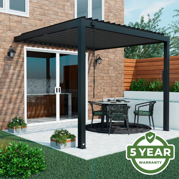 The Sarasota Louvered Pergola elevates your outdoor living space with beautiful modern style. Built with heavy-duty, galvanized steel, its adjustable louvers can be easily opened to allow filtered sunlight through or closed completely to enjoy shade and weather protection. Complete with powder-coated steel posts and anchoring plates, the Sarasota is Pro-Tect™ tested and proven to withstand up to 2,100 pounds of roof weight and 100 mph wind speeds*, ensuring a lasting upgrade to your backyard. The integrated drainage system directs rainwater to downspouts in the steel posts and is equipped with gutter guards to prevent debris blockages. The 100% galvanized powder-coated steel is not only completely maintenance free but is also rust and corrosion-resistant for contemporary charm that’s built to last. Boasting sleek lines and an elegant black finish, this contemporary patio pergola accommodates seating, tables, and decor for a stylish, comfortable outdoor living space. With our patented PowerPort™, featuring three electrical outlets and USB ports, it’s easy to connect lighting, music, devices, and more. This outdoor pergola kit is ready to assemble and offers guided instructions through the BILT® app for easier installation. Backed by a 5-year warranty, the Sarasota Pergola creates the ideal backyard setting for memorable gatherings.