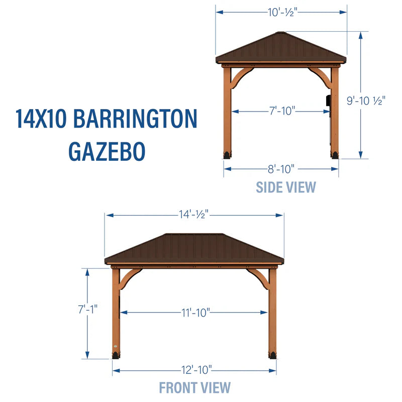 Meet the Barrington Gazebo from Backyard Discovery and transform your outdoor area into the perfect sanctuary. The heavy-gauge galvanized steel hip roof combines classic style with durable construction, providing protection from rain, snow, and sun. Designed for exceptional stability and resilience, this wooden gazebo is Pro-Tect™ tested and proven to withstand up to 7,600 pounds or 30 inches of snow, and 100 mph winds*. The pre-stained finish adds a charming aesthetic while the beautiful cedar wood frame is resistant to rot and decay, ensuring the Barrington is a long-lasting addition to your backyard. With our exclusive PowerPort™ electrical outlets and USB ports, it's easy to play music, charge your devices, and add ambient lighting to create the perfect setting. This versatile outdoor gazebo is perfect for enhancing any backyard while easily accommodating comfortable furniture and decorative elements to match your style. Whether you're seeking a private retreat, a dedicated outdoor space for yoga or exercise, or a charming venue for backyard parties, the Barrington patio gazebo adapts effortlessly to your needs. Assembly is streamlined with pre-cut, pre-stained, and pre-drilled components, while the interactive BILT® app provides step-by-step guidance. Bring the Barrington Gazebo home today and create your dream backyard sanctuary.
