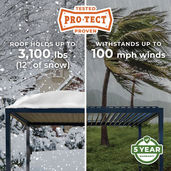 Engineered for superior performance, the Sarasota features strong galvanized steel construction and heavy-duty anchoring plates to withstand up to 3,100 pounds of snow load and 100 mph winds.