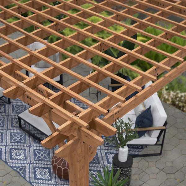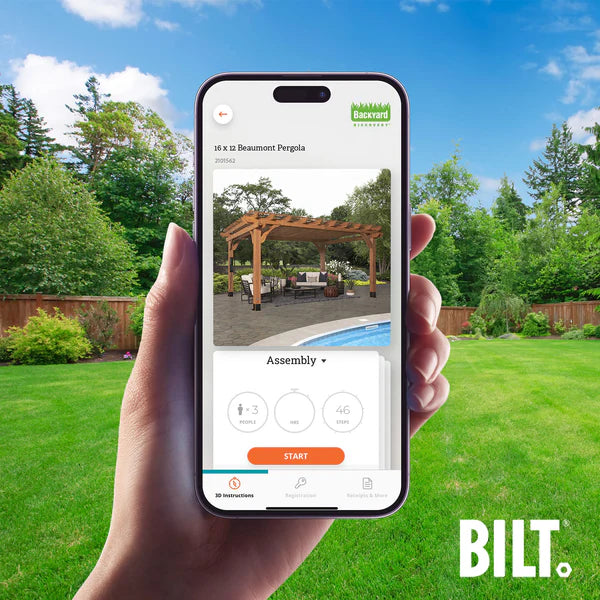 Enhance your backyard with the stunning Beaumont Pergola, where traditional design meets superior engineering. Constructed from 100% cedar wood, it exudes natural charm while providing lasting resistance against decay. From dinner parties to quiet morning coffee, the versatile design creates endless possibilities for your outdoor living space. Thoughtfully crafted with dual structural cross beams, robust support posts, and elegant corbels, this patio pergola delivers exceptional strength and enduring beauty. It’s Pro-Tect™ tested and proven to withstand winds of up to 100 mph* and includes thick, powder-coated steel anchoring plates, ensuring stability in the most extreme weather conditions. Our patented PowerPort™ features three USB ports and three electrical outlets to power a wide range of devices, lighting, and accessories. The trellis roof adds a beautiful classic aesthetic and is perfect for hanging potted plants or climbing vines. It also allows sunlight to filter through, creating a pleasant blend of light and shade that’s ideal for outdoor seating areas, patios, and gardens. This wooden pergola kit is ready to assemble with pre-cut, pre-drilled, and pre-stained components, while the interactive BILT® app provides guided instructions so you can build your backyard sanctuary with less hassle. Elevate your outdoor lifestyle with the Beaumont Pergola.