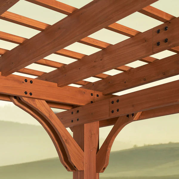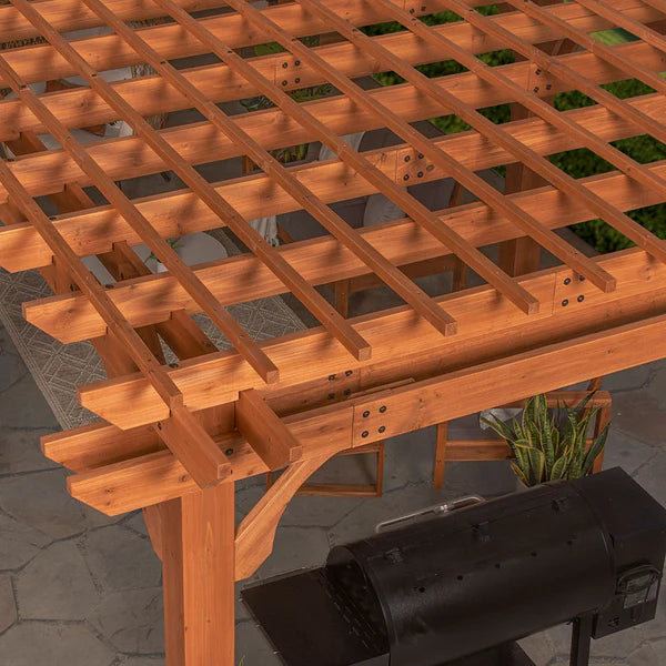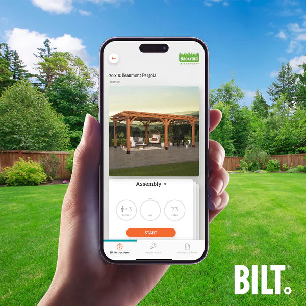 Enhance your backyard with the stunning Beaumont Pergola, where traditional design meets superior engineering. Constructed from 100% cedar wood, it exudes natural charm while providing lasting resistance against decay. From dinner parties to quiet morning coffee, the versatile design creates endless possibilities for your outdoor living space. Thoughtfully crafted with dual structural cross beams, robust support posts, and elegant corbels, this patio pergola delivers exceptional strength and enduring beauty. It’s Pro-Tect™ tested and proven to withstand winds of up to 100 mph* and includes thick, powder-coated steel anchoring plates, ensuring stability in the most extreme weather conditions. Our patented PowerPort™ features three USB ports and three electrical outlets to power a wide range of devices, lighting, and accessories. The trellis roof adds a beautiful classic aesthetic and is perfect for hanging potted plants or climbing vines. It also allows sunlight to filter through, creating a pleasant blend of light and shade that’s ideal for outdoor seating areas, patios, and gardens. This wooden pergola kit is ready to assemble with pre-cut, pre-drilled, and pre-stained components, while the interactive BILT® app provides guided instructions so you can build your backyard sanctuary with less hassle. Elevate your outdoor lifestyle with the Beaumont Pergola.