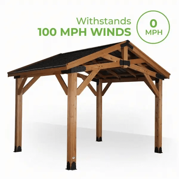 The Backyard Discovery Norwood Gazebo combines beautiful style with modern comfort. Expertly crafted from high-quality 100% cedar, this wooden gazebo delivers elegant style and natural durability. The Norwood stands as a Pro-Tect™ tested and proven structure, engineered to withstand up to 12,600 pounds of roof weight and wind speeds up to 100 mph* providing resilience through every season. Its strong, 29-gauge galvanized steel roof offers superior protection against corrosion and dents for lasting durability. Adorned with black steel accents, the gazebo's peak roof design adds a sophisticated look while providing plenty of shade and protection from inclement weather. The versatile design offers the ideal setting for elevating your outdoor living. From relaxing with a cup of coffee to entertaining guests, this backyard gazebo adapts to any occasion. Our exclusive PowerPort™ brings convenience and lets you add a custom touch. It features three electrical outlets and three USB ports to easily connect lighting, play your favorite music, or charge devices. This patio gazebo kit is ready to assemble with pre-cut, pre-drilled, and pre-stained components, while the interactive BILT® app provides step-by-step guidance. Experience outdoor living at its finest with the Norwood Gazebo—where comfort meets timeless style in your own backyard sanctuary.