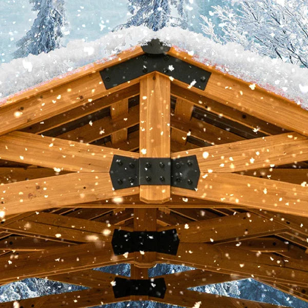 The Backyard Discovery Norwood Gazebo combines beautiful style with modern comfort. Expertly crafted from high-quality 100% cedar, this wooden gazebo delivers elegant style and natural durability. The Norwood stands as a Pro-Tect™ tested and proven structure, engineered to withstand up to 15,900 pounds of roof weight and wind speeds up to 100 mph* providing resilience through every season. Its strong, 29-gauge galvanized steel roof offers superior protection against corrosion and dents for lasting durability. Adorned with black steel accents, the gazebo's peak roof design adds a sophisticated look while providing plenty of shade and protection from inclement weather. The versatile design offers the ideal setting for elevating your outdoor living. From relaxing with a cup of coffee to entertaining guests, this backyard gazebo adapts to any occasion. Our exclusive PowerPort™ brings convenience and lets you add a custom touch. It features three electrical outlets and three USB ports to easily connect lighting, play your favorite music, or charge devices. This patio gazebo kit is ready to assemble with pre-cut, pre-drilled, and pre-stained components, while the interactive BILT® app provides step-by-step guidance. Experience outdoor living at its finest with the Norwood Gazebo—where comfort meets timeless style in your own backyard sanctuary.