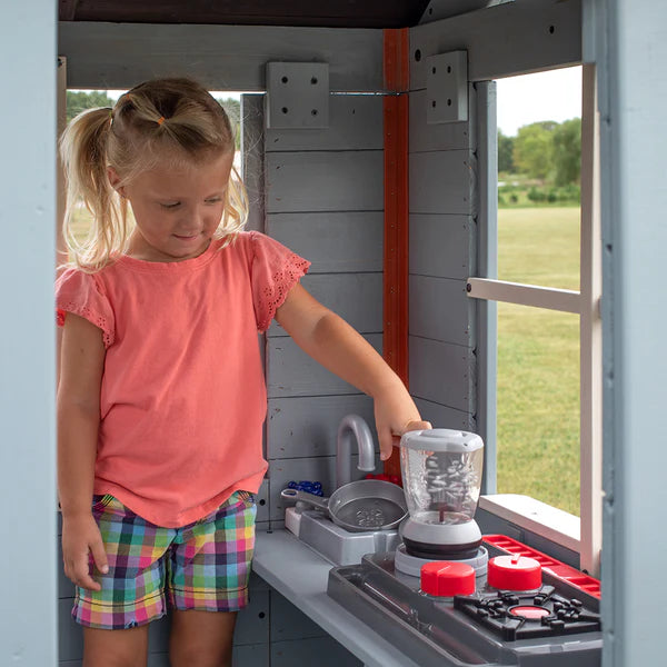 Elevate fun to a new level with Backyard Discovery's Beacon Heights Playhouse. Designed with a variety of engaging features to inspire creative play, this stylish outdoor playhouse is perfectly sized for smaller yards without sacrificing fun. The elevated design includes a wrap-around deck, speedy wave slide, and flat-step entry ladder, ensuring easy accessibility for children of various ages. Crafted from high-quality cedar wood and finished in a soft blue with crisp white trim, this wooden playhouse delivers a charming aesthetic to enhance any backyard area. The bright and airy interior features large windows that welcome natural light, creating an inviting space for play. Kids will love the working half door, bell, and interactive play kitchen complete with toy stovetop, sink, battery-powered appliances, and engaging accessories. This kids' playhouse transforms everyday moments into exciting adventures. Whether they're serving up imaginative treats in the play kitchen, zooming down the wave slide, or hosting magical tea parties on the deck, the Beacon Heights provides endless opportunities for active play and social development. The built-in growth board lets you track and celebrate your children's height milestones, while creating lasting memories. Built to last, the Beacon Heights Playhouse creates an enchanting retreat where adventures begin.