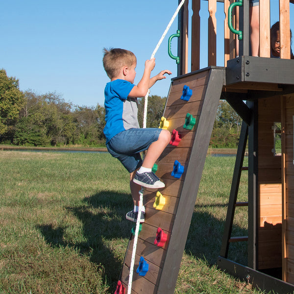 Embark on backyard adventures with the Canyon Creek Swing Set by Backyard Discovery. This charming wooden swing set boasts a variety of features that inspire active outdoor play. The towering rock wall invites daring climbing challenges, while the 8-foot speedy wave slide offers thrilling rides back to the ground. Kids can soar on the exciting web swing or enjoy traditional swinging fun on two comfortable belt swings. Access to the upper clubhouse is a breeze thanks to the flat-step ladder, providing easy entry for children of various ages. Imaginations will take flight in the different play spaces. The charming lower playhouse transforms into a fun bustling café with its a toy BBQ grill, sink, and play food for creative cooking adventures. Little chefs can serve up their culinary creations in the picnic area complete with a built-in table and seating. Meanwhile, the upper clubhouse becomes a command center with its toy telescope, chalkboard, and steering wheel, perfect for make-believe expeditions. Crafted from durable cedar wood, this backyard swing set is ready to assemble and offers guided instructions with the interactive BILT® app. Explore the Canyon Creek and create a backyard playground that brings new possibilities for playful discovery every day.