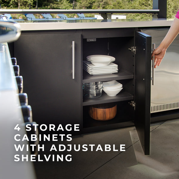 Constructed from corrosion-resistant galvanized steel, this storage system includes four spacious cabinets and five drawers, offering generous space for all your kitchen supplies. Designed to last, the soft-close hinges and drawer slides add a high-end feel and smooth functionality to your alfresco kitchen design.