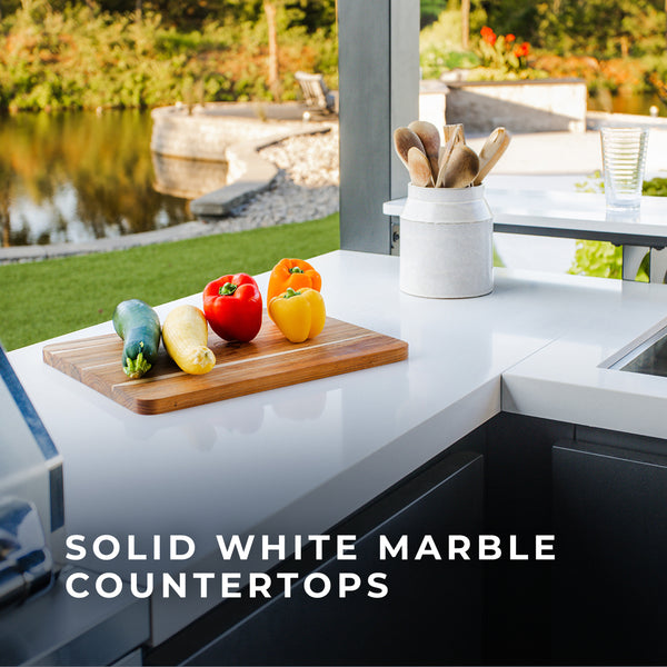 Refined solid white marble countertops infuse your outdoor kitchen with a luxurious and sophisticated aesthetic, adding classic yet modern style. Fine craftsmanship provides enduring performance that’s ideal for everyday use and entertaining.