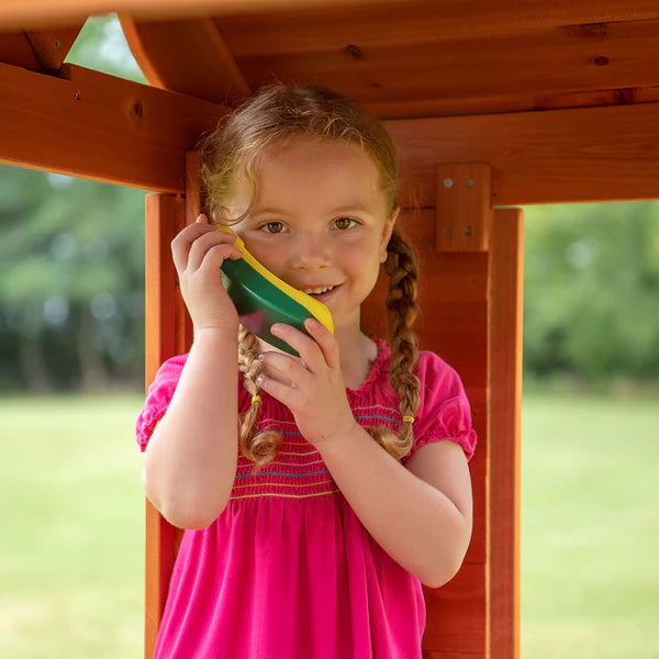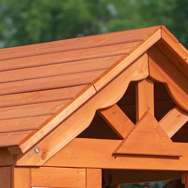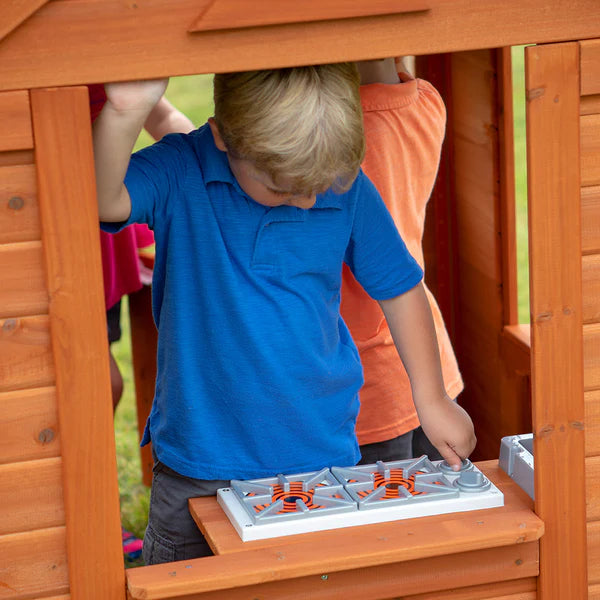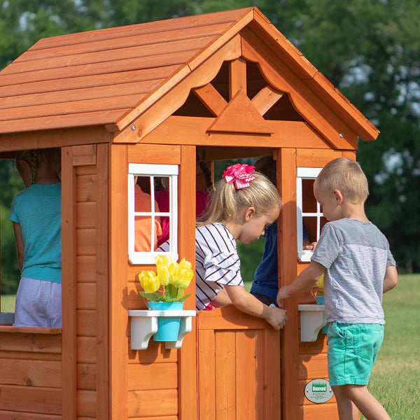 The Timberlake Playhouse from Backyard Discovery brings endless fun to your outdoor space. This charming wooden playhouse combines elegant design with engaging features, creating the perfect space for imaginative play and outdoor adventure. Designed with attention to detail, this outdoor playhouse welcomes children with wide windows that flood the interior with natural light and fresh breezes. The inviting style features flowerpot holders and a working half door, adding architectural charm that enhances any backyard setting. A built-in snack bar window creates opportunities for creative play, perfect for serving up make-believe treats to friends and family. Inside this delightful kids' playhouse, young imaginations come alive with interactive features including a play sink, toy stove, and cordless phone. The roomy interior provides plenty of space for multiple children to play comfortably. This inviting play space is designed to create an engaging environment where children can explore, create, and play to their heart's content. Crafted from durable cedar wood, the Timberlake provides a sturdy and reliable backyard playset that's ready to assemble and built to last. From solo adventures to group play dates, this versatile wood playhouse offers a magical place for making childhood memories and inspiring countless opportunities for fun and creativity.